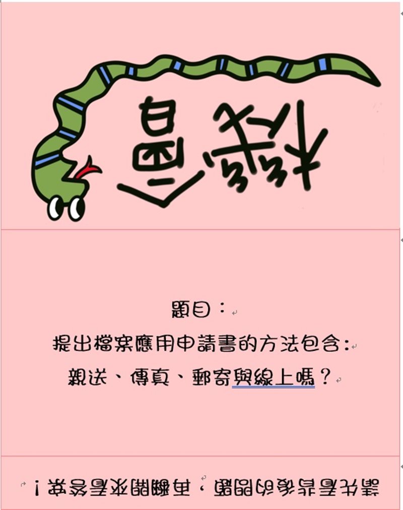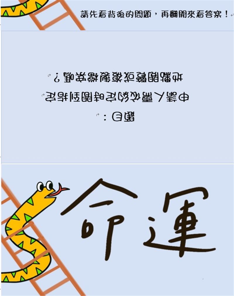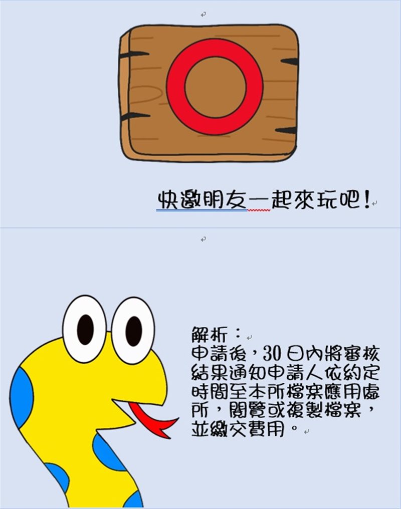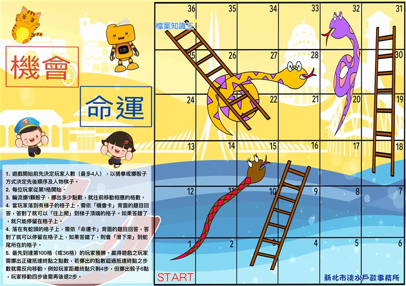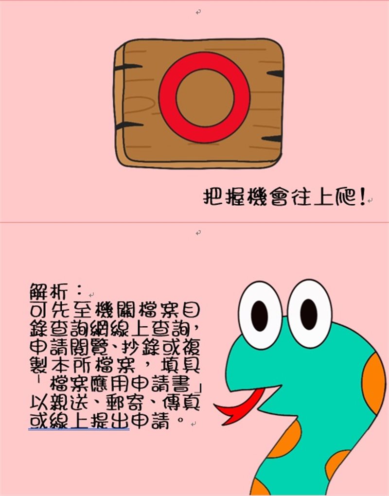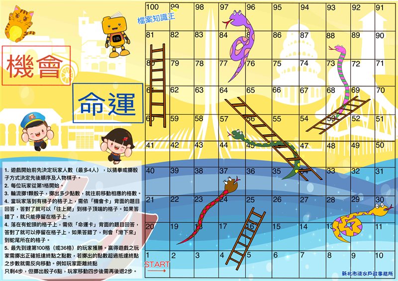遊戲板某些格子上畫有「梯子」,有些則畫有「蛇」。本件作品另結合了「大富翁」遊戲內「機會卡」與「命運卡」的元素,機會卡與命運卡背面提供與「檔案應用」相關的是非題,機會卡與命運卡內頁則為答案及詳解。當玩家落到有梯子或有蛇頭的格子上時,須回答「機會卡」或「命運卡」背面的是非題,「機會卡」答對了就可以「往上爬」到梯子頂端的格子,「命運卡」如果答錯了,則會「滑下來」到蛇尾所在的格子,最高抵達終點的玩家獲勝。